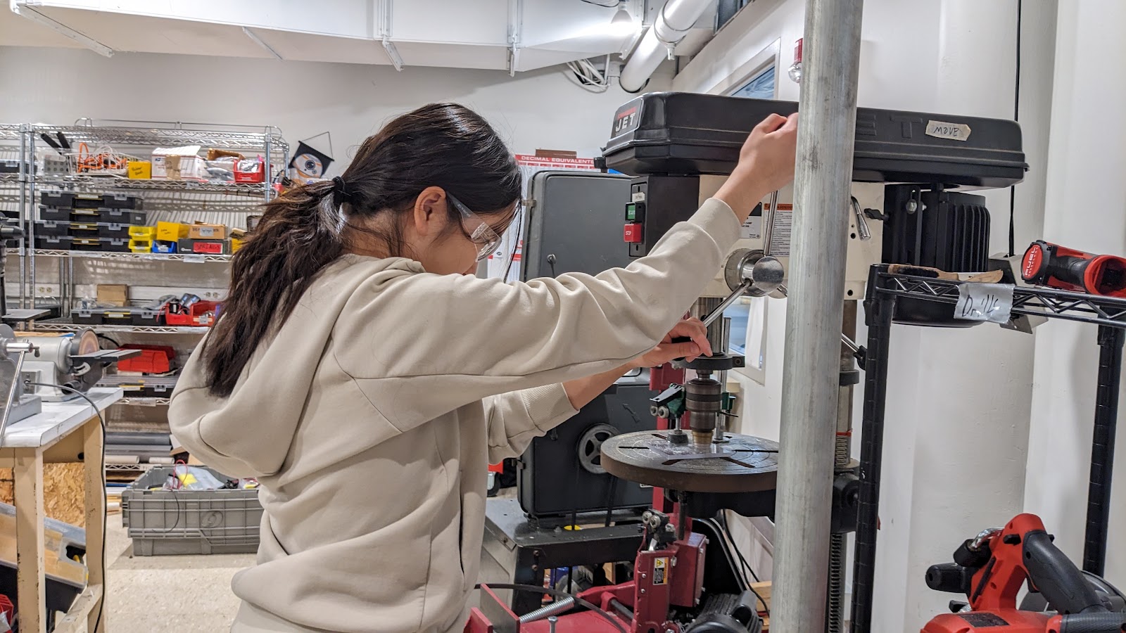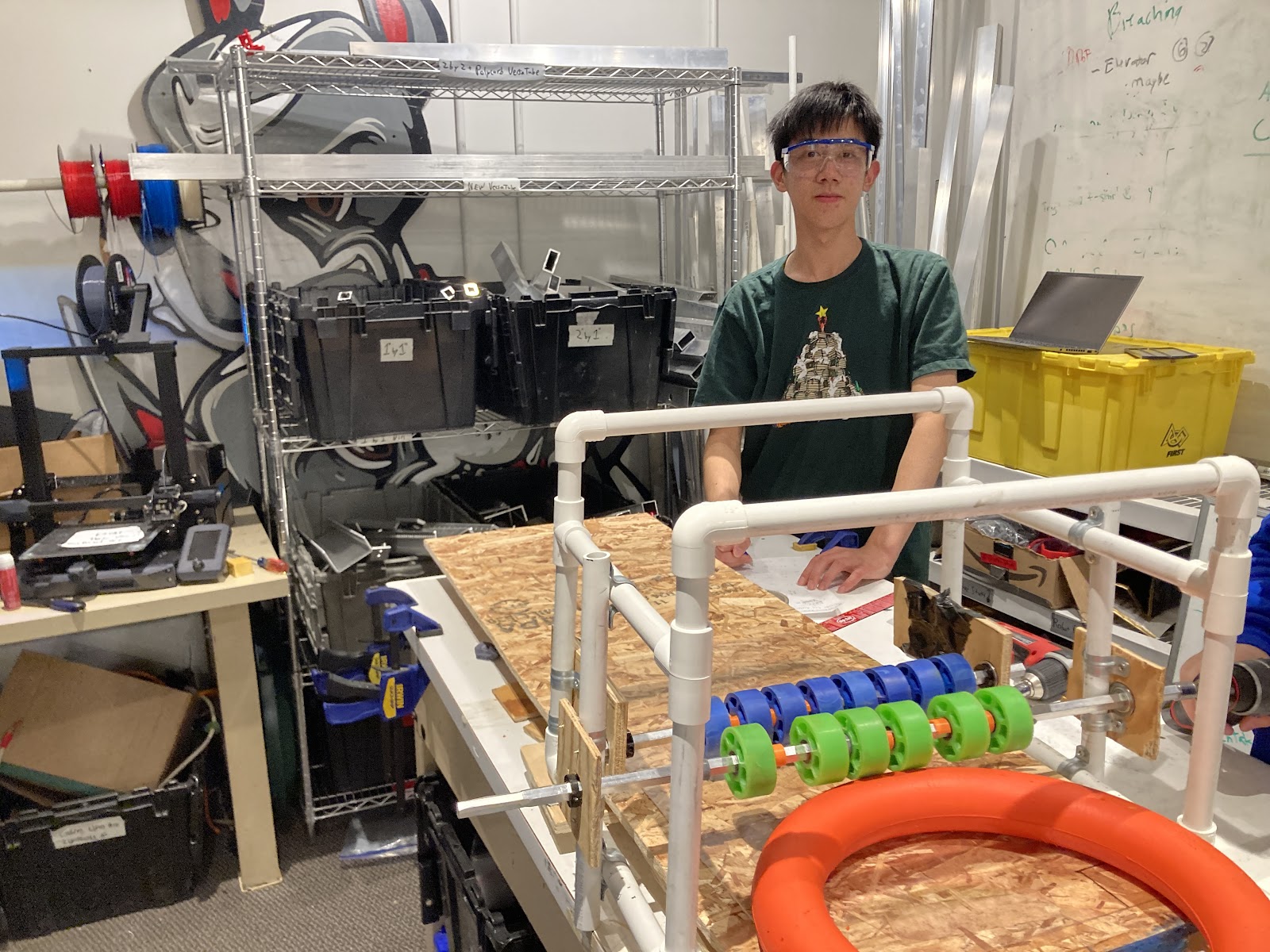 We can’t believe a month of build season is nearly behind us! It was just the beginning of January when we got together for kickoff and this year’s game was announced: Crescendo! Two alliances of three teams each will compete to pick up foam rings (notes) and score them in either the speaker or the amp. At the end of the match, robots can attempt to climb a chain at the stage. (See the official game video here). Throughout that weekend, students read through the game manual together, discussed potential strategies, and considered various robot types that we might encounter in the field.